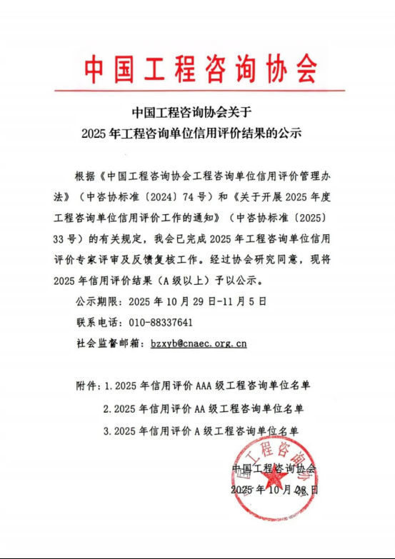 近日,中国工程咨询协会发布了“2025年工程咨询单位信用评价结果”,公司凭借过硬的综合实力成功荣获AAA级信用评价等级,为公司发展增添新荣誉。
